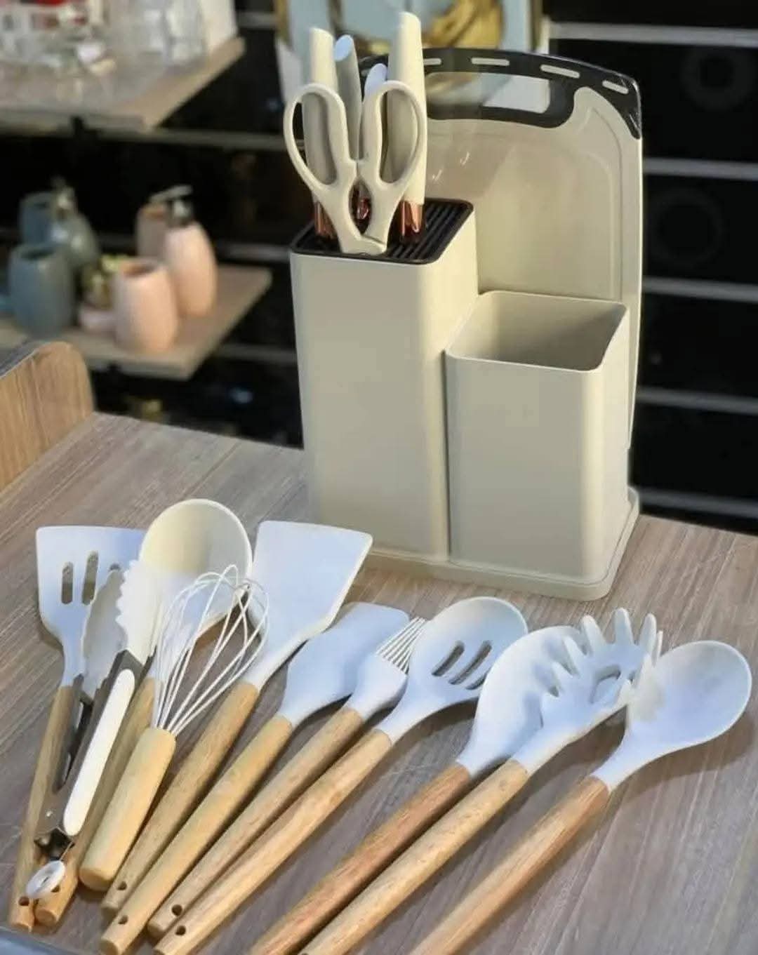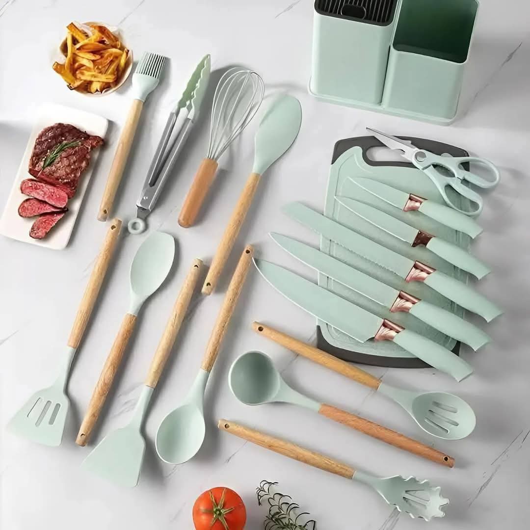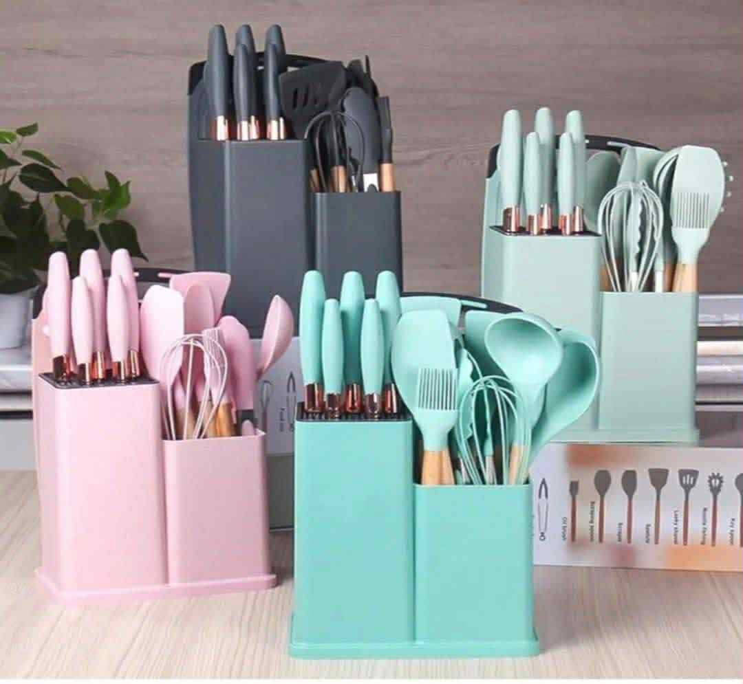 من خمس سكاكين و مقص ومساك تحمير سيلكون و فرشة توزيع و بلانشة تقطيع و مضرب سيلكون …… معالق مغرفة ومعلقة وشيالة ومعلقة مكرونه وسباتيولا.